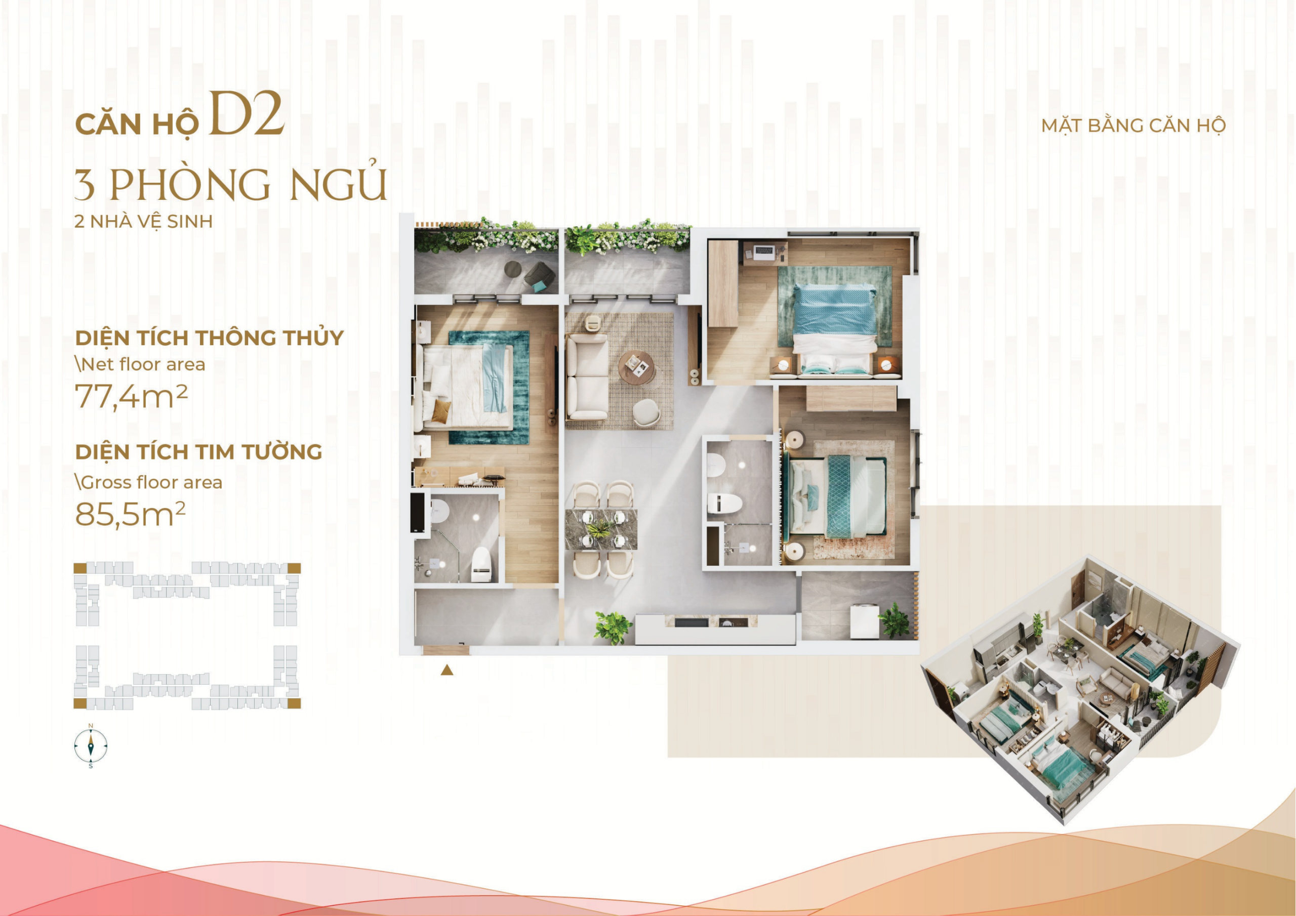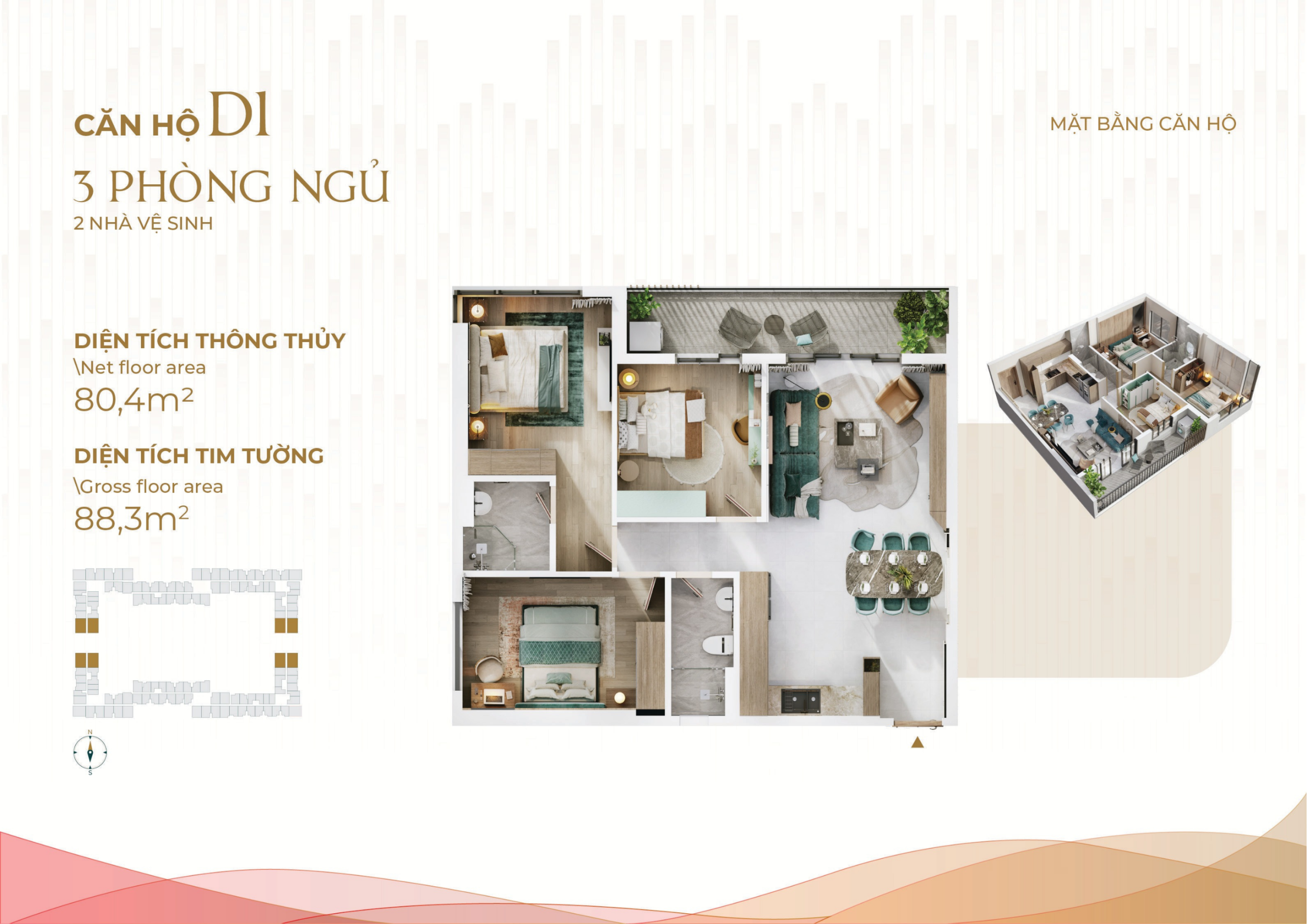 | Căn hộ 3PN | 80m² – 88m² | Từ 2,15 tỷ – 3,04 tỷ |